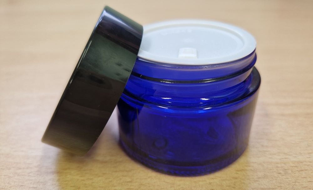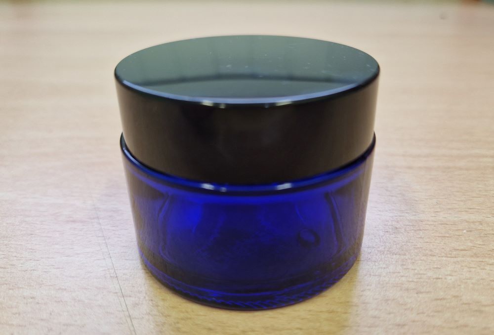 Staklena plava teglica s plastičnim crnim poklopcem 50 ml. Idealna ambalaža pakiranje kozmetičkih krema.